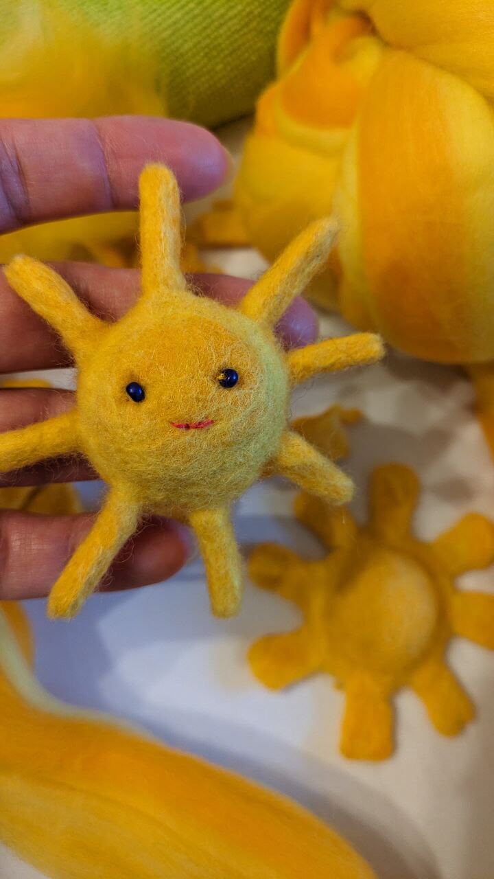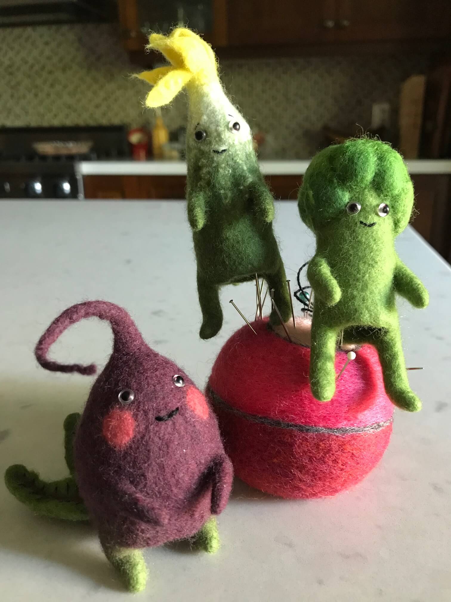 The veggie course was terrific. Yara is an amazing instructor, explaining why things are done the way they are, offering options for materials and equipment (nice to be able to use things you already have), anticipating areas where you might struggle and offering ways to repair your mistakes and get back on track. Her techniques (and repair suggestions) will be useful in other felting projects. I appreciate the recorded workshop because I like to watch it first, then try to follow along on the second viewing. It's nice to be able to go at my own speed and to rewatch sections of the workshop that are tricky for me. I made the broccoli, beet root and cucumber. For the cucumber my neps didn't give the effect I was aiming for and next time I would try Yara's knot suggestion. These are my first efforts - very cute I think! Beet root is my favourite because she seems to have the most personality. I love the trailing beet leaves.