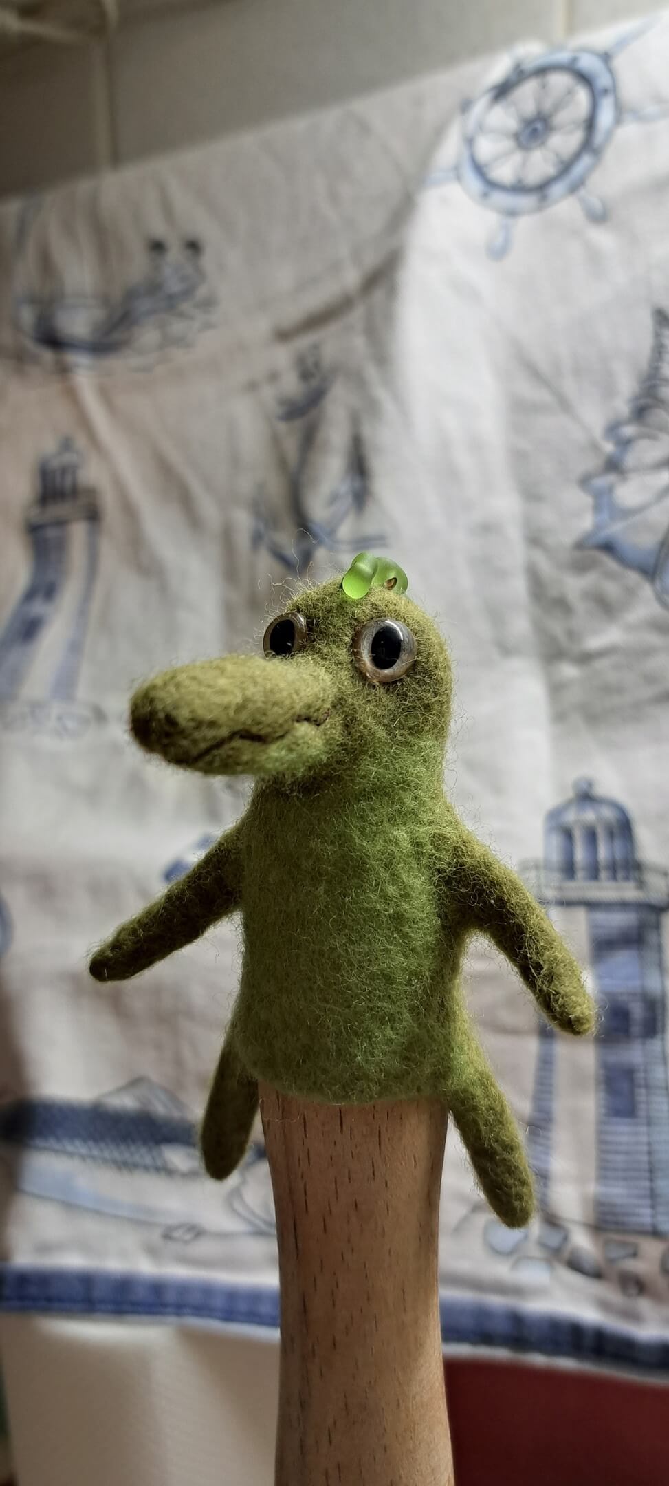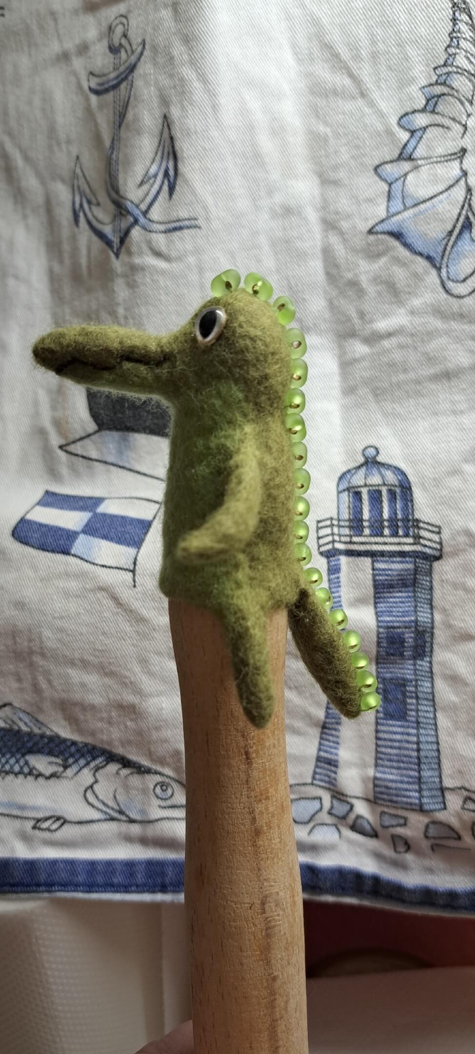 Ездила в гости, на подарок валяла крокодила (друзья собирают коллекцию крокодилов). За основу взяла ежика без ушей. Гребешок сразу думала про бисер. Все звери получались у меня мордатые, а тут видать поспешила, не хватает массивности. Но никто не спорил, признали крокодилом )