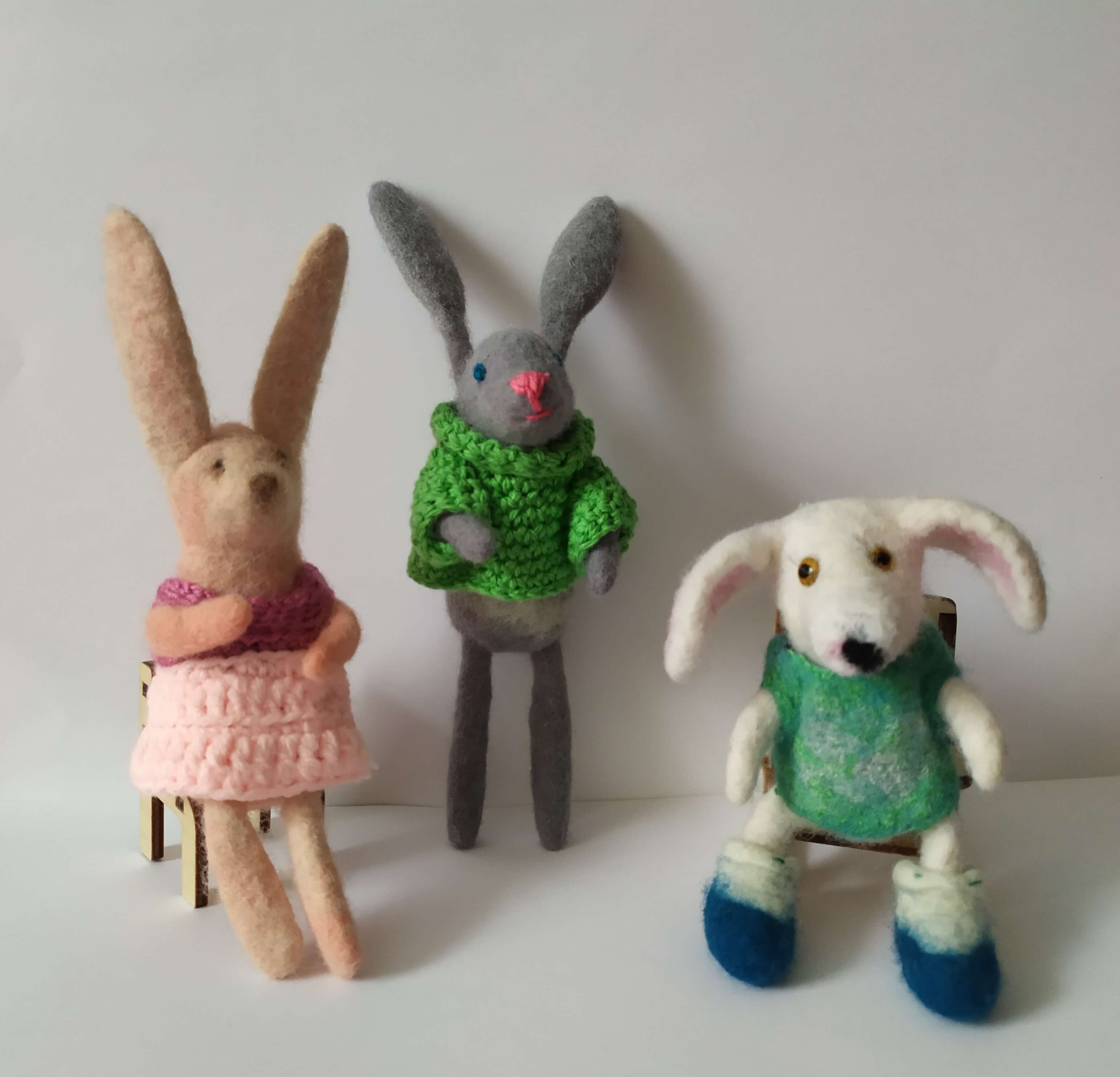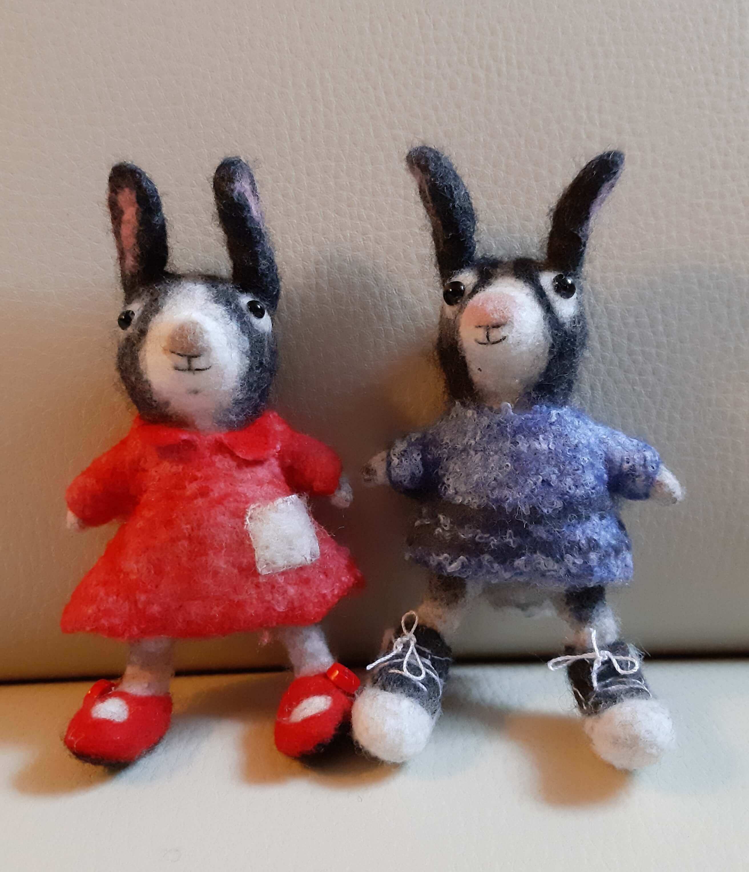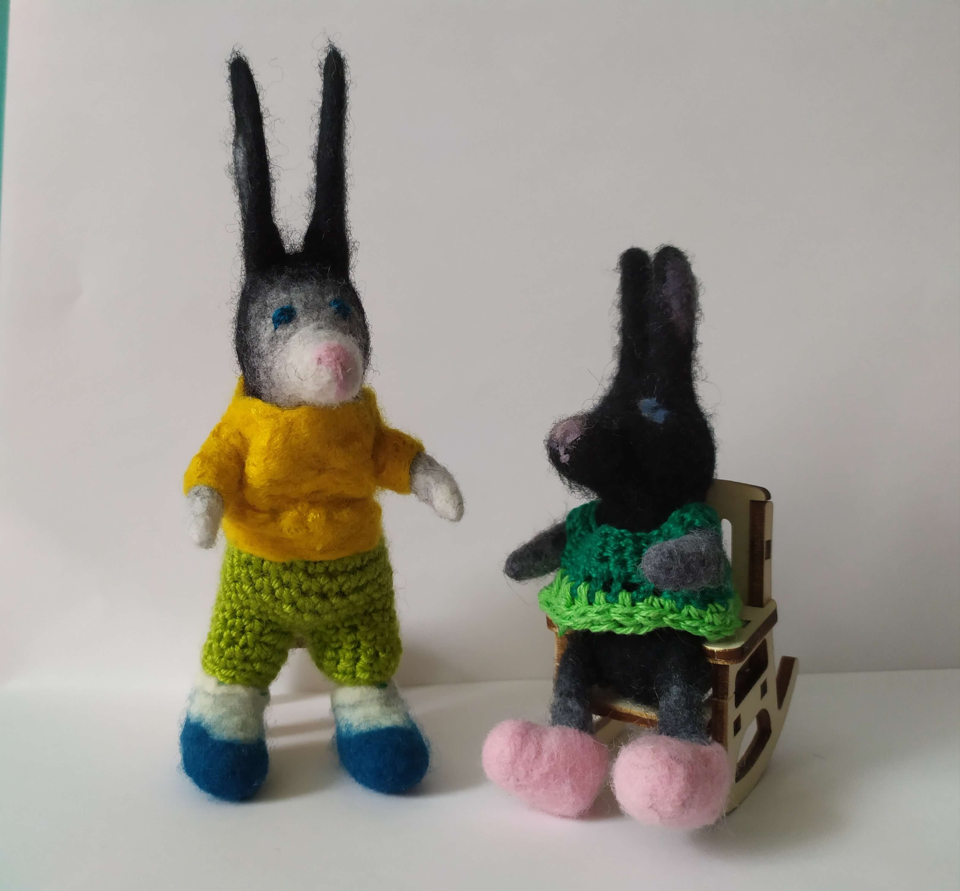 2 little rabbits. I like them very much. I'm thinking about knitting a pair of trousers for the boy.