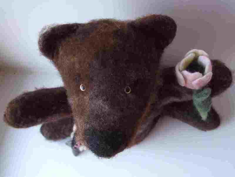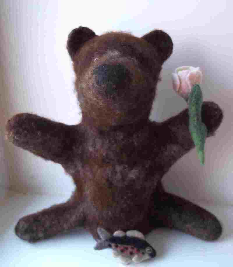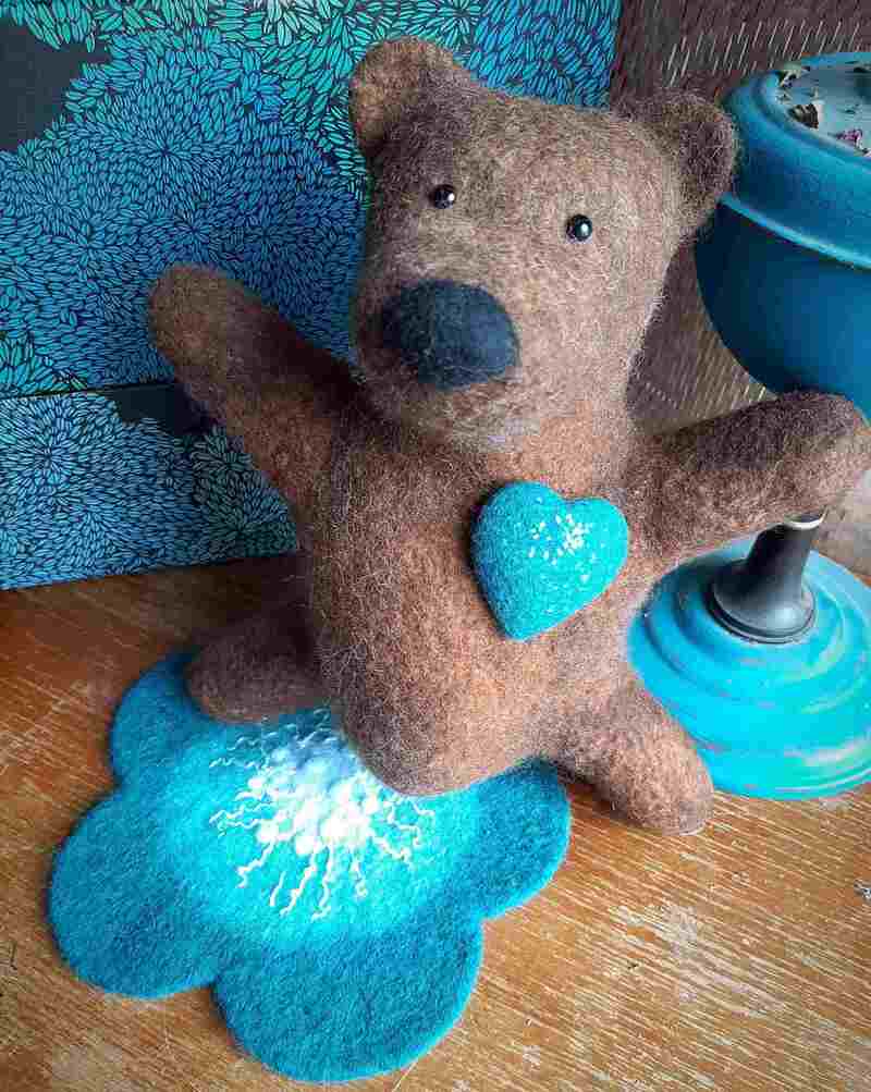 Вот и мой Медведь. Он получился идеальной толщины везде, но сзади более пестренький. В этом формате мне удалось все сделать лучше чем просто по МК. Вероятно потому, что сразу получаешь ответы на все возникающие по ходу вопросы. Очень удивлена, что флис весь привалялся без проблем, хотя думала, что все будет сложнее. Отличная группа и отлично работать с таким Мастером, как Ярослава. И еще раз огромное спасибо. И уже с нетерпением жду новой встречи.